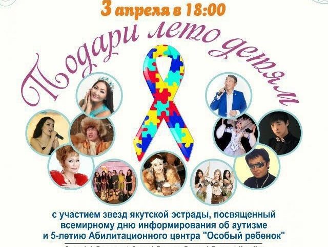 АНО Абилитационный центр «Особый ребенок» был открыт 2 апреля 2013 г, во Всемирный день распространения информации об аутизме. К 5-летию нашего центра, 3 апреля во Дворце детства с 18:00 ч пройдёт Благотворительный концерт «Подари лето детям» с участием артистов якутской…